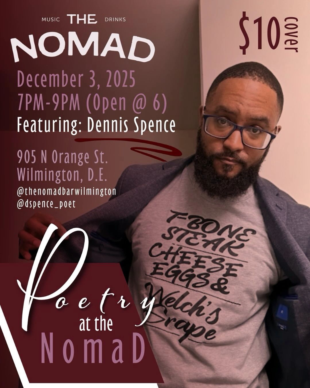 Dennis Spence is bringing Poetry to Nomad! Come feel some good vibes with good drinks with good people. Listen to the words of Dennis and bless the mic with your expression. Limited seating available, so don't wait!